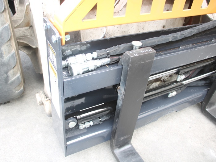 The Skid Steer Pallet Fork Hydraulic Adjustable are 58" long Class II are 1 1/2 inches thick, 4 inches wide, completely heat treated. Our forks are completely adjustable and come with side steps to make it easy for you to climb in and out of you machine. The frame is constructed from 3” channel and 2” x 3” angle that is 3/8” thick. The forks are rated at 4000 lbs. These forks are designed for Smaller loaders that don't need the extra capacity of our normal skid steer loader.These forks permit the operator to hydraulically infinitely variably adjust the width of the tines without having to exit the operators cab.