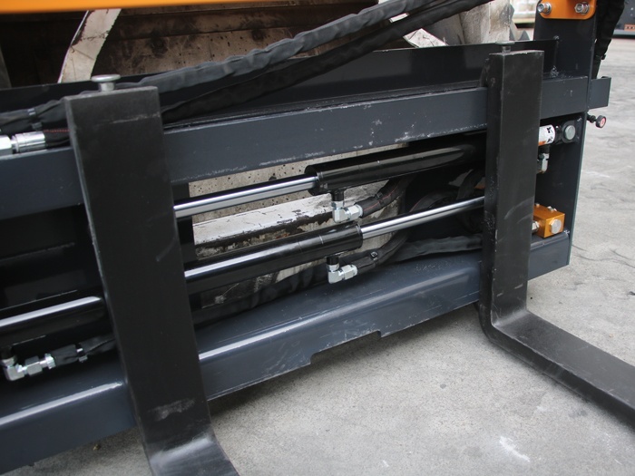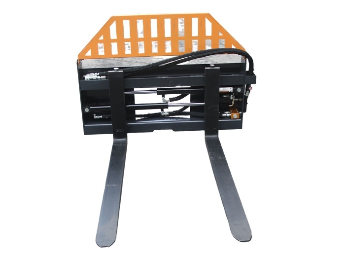 The Skid Steer Pallet Fork Hydraulic Adjustable are 58" long Class II are 1 1/2 inches thick, 4 inches wide, completely heat treated. Our forks are completely adjustable and come with side steps to make it easy for you to climb in and out of you machine. The frame is constructed from 3” channel and 2” x 3” angle that is 3/8” thick. The forks are rated at 4000 lbs. These forks are designed for Smaller loaders that don't need the extra capacity of our normal skid steer loader.These forks permit the operator to hydraulically infinitely variably adjust the width of the tines without having to exit the operators cab.